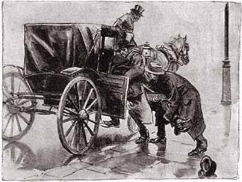 – Ah ! je voudrais bien le savoir ! Ca s’est passé ce matin, monsieur ! M. Warren est chronométreur chez Morton & Waylight’s, à Tottenham Court Road…Il faut qu’il parte de la maison avant sept heures. Eh bien, ce matin, il n’avait pas fait dix pas dans la rue que deux hommes se sont approchés de lui par-derrière, lui ont jeté un manteau sur la tête, et l’ont fourré dans un fiacre qui était rangé au bord du trottoir. Ils l’ont promené pendant une heure, puis ils ont ouvert la portière et l’ont jeté dehors. Il est tombé sur la route, et il était tellement abasourdi qu’il ne sait même pas ce qu’est devenu le fiacre… quand il s’est relevé, il a découvert qu’il se trouvait sur Hampstead Heath ; alors il a pris le bus pour rentrer à la maison et à présent il est couché sur le canapé. Moi je suis venue tout de suite vous raconter ce qui est arrivé.